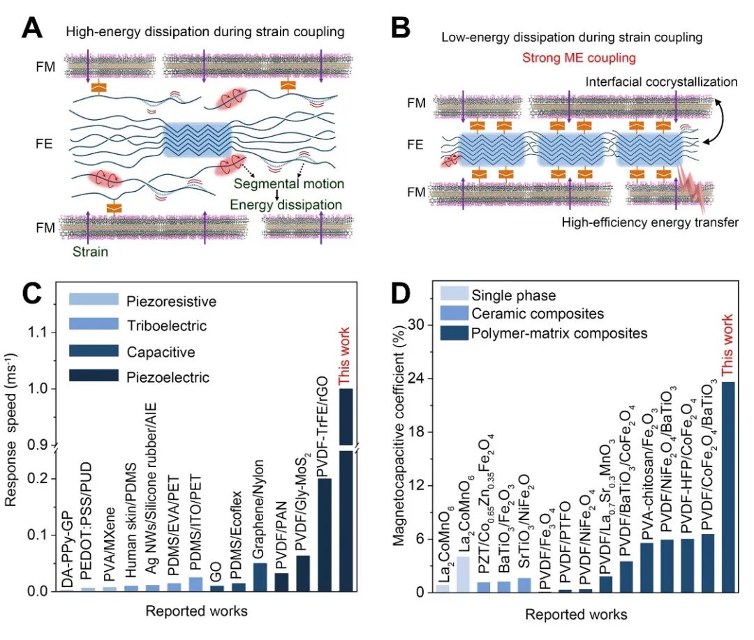 纳米复合薄膜的磁电耦合机理以及性能对比图。(A)低结晶度和(B)高结晶度下磁电耦合过程的机理示意图。(C)磁电传感器的响应速度对比图。(D)磁电复合薄膜的磁容系数对比图。