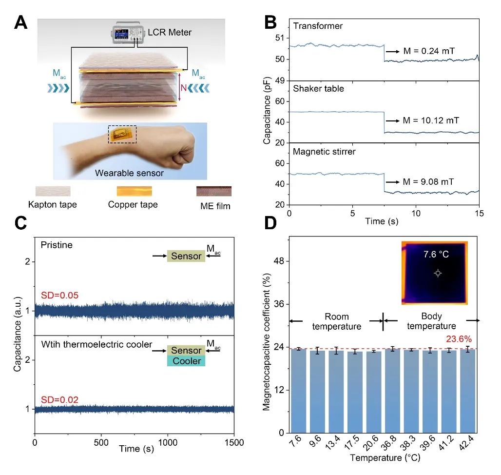磁电传感器的多功能应用。(A)可穿戴磁容传感器的结构示意图及其(B)对生活中多种磁场的检测结果。(C)在外加磁场下集成或不集成热电冷却器的电容值。(D)不同温度下的磁容系数,插图显示了热电冷却器的均匀温度分布情况。