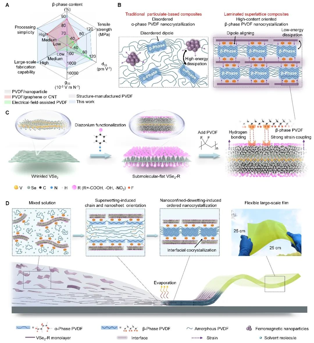 高性能磁电薄膜的制备。(A)典型聚合物基铁性材料的性能雷达图对比。(B)传统颗粒基磁电复合材料与层状磁电复合材料的结构示意图。(C)VSe2、重氮化修饰VSe2以及诱导PVDF的β相成核示意图。(D)磁电薄膜的制备过程与机理示意图。
