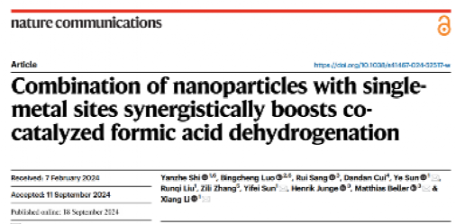 近日,北京航空航天大学能源与动力工程学院、betway西汉姆联责任教授孙也团队,联合北京航空航天大学能源与动力工程学院李想副教授、孙轶斐教授、中国农业大学理学院应用物理系罗炳程教授、德国莱布尼茨催化研究所Matthias Beller教授等人在能源催化功能材料研究方面取得新进展,在国际顶级期刊《自然·通讯(Nature Communications)》在线发表了题为“Combination of Nanoparticles with Single-Metal Sites Synergistically Boosts Co-Catalyzed Formic Acid Dehydrogenation”的研究成果。