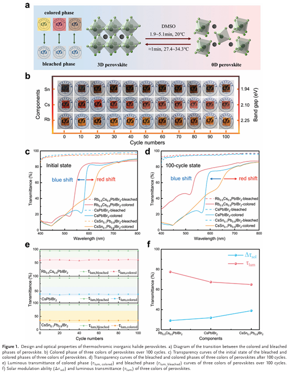近期,黄建媚教授团队选择全无机卤族钙钛矿作为智能窗户的光学材料,利用二甲基亚砜(DMSO)蒸气作为诱导剂,在室温下实现着色相和透明相之间的快速可逆切换。为了获得具有不同光学性能和转变性能的钙钛矿智能窗,通过合金化制备了红色CsPbIBr2、黄色 Rb0.5Cs0.5PbIBr2和棕色CsSn0.1Pb0.9IBr2钙钛矿材料。这项研究为制备突出的转变性能和长循环稳定性的钙钛矿智能窗提供了新的思路,以题为“Minute-Level Room-Temperature Switching and Long Cycle Stability of Thermochromic Inorganic Perovskite Smart Windows”的论文发表在《Advanced Materials》上。