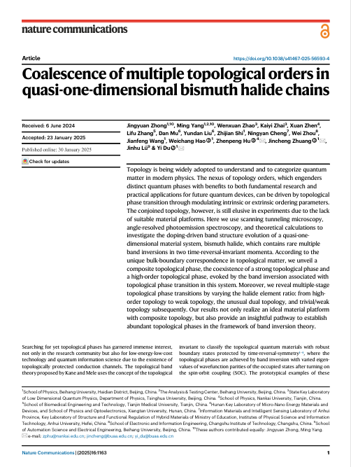 近日,物理学院表面物理与量子物质研究团队与清华大学、南开大学等合作,在实现多重可控拓扑相变研究方面取得重要进展,相关研究成果于1月30日以“Coalescence of multiple topological orders in quasi-one-dimensional bismuth halide chains”为题在线发表于《Nature Communications》上。其中,物理学院博士生钟景元、betway西汉姆联物理性能表征平台教师杨明为共同第一作者。