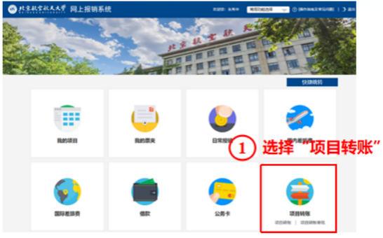 四、课题组负责人根据“费用结算单及扣费明细”表中载明的金额,登录网上报销系统——项目转账模块,点击“项目转账”。