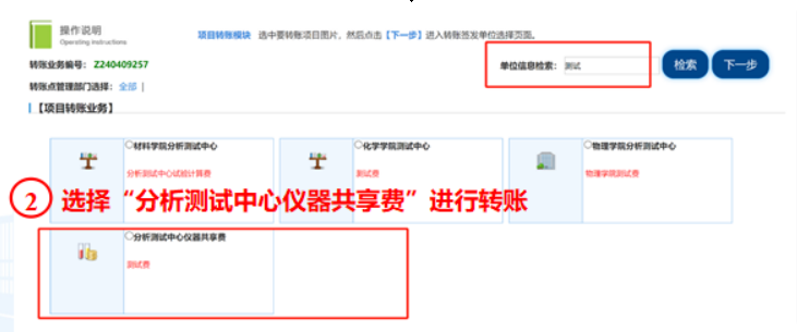 五、进入转账点选择页面,选择“betway西汉姆联仪器共享费”(可输入关键字进行信息检索)。点击“下一步”,填写项目转账明细,核对信息无误后填写金额、附件张数及用途。