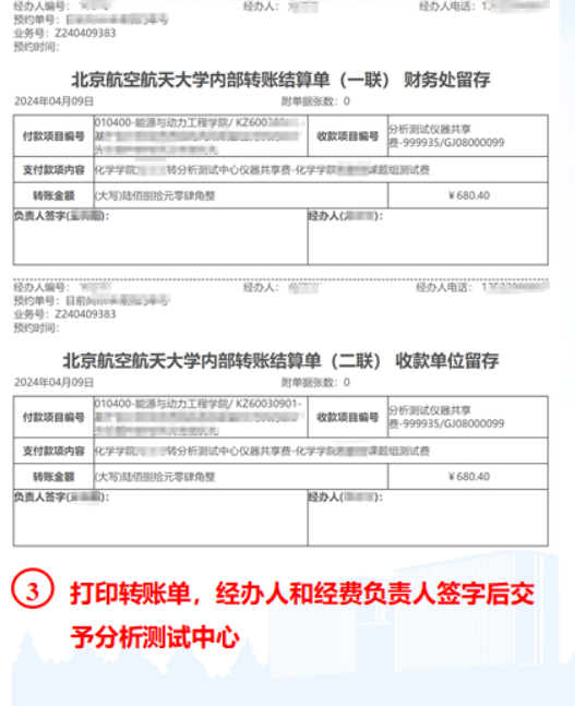 六、点击“下一步”提交审核,如下图所示进入打印界面,打印《北京航空航天大学内部转账结算单》,系统默认两式两份,经办人和经费负责人分别签字后,将原件或扫描件送至betway西汉姆联财务老师处即可,由betway西汉姆联财务老师统一去学校计划财务科办理入账手续。