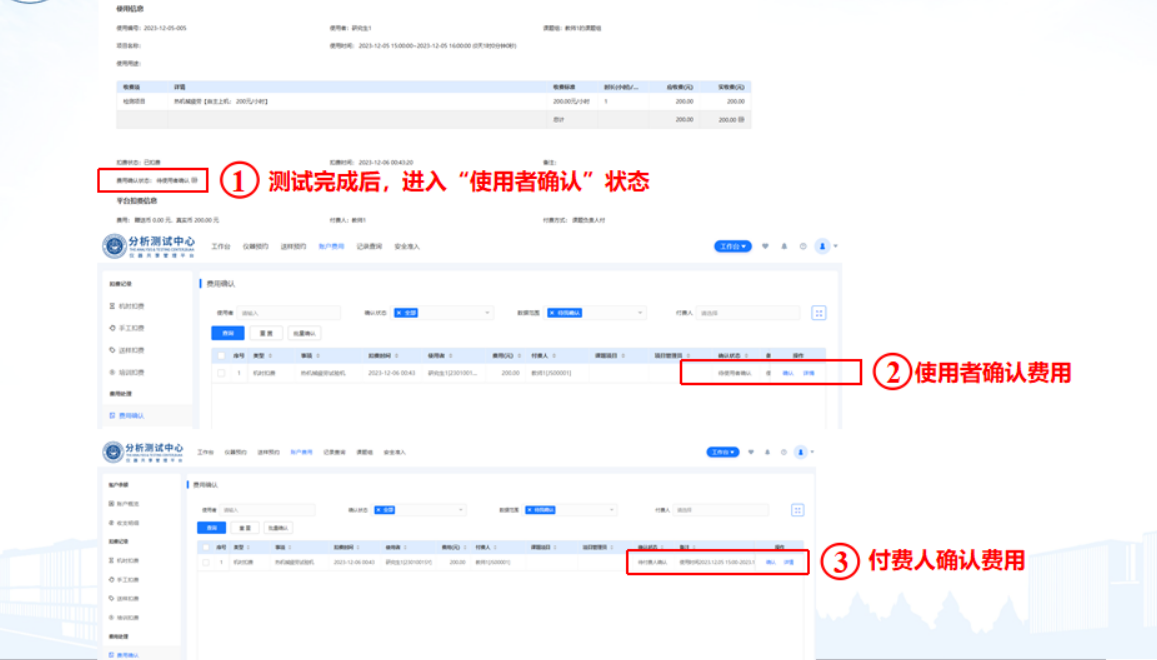 二、校内用户完成测试后,课题组负责人或课题组授权管理成员及时登录预约系统进行费用确认,若有异议,请及时与测试老师沟通,复核测试费用。